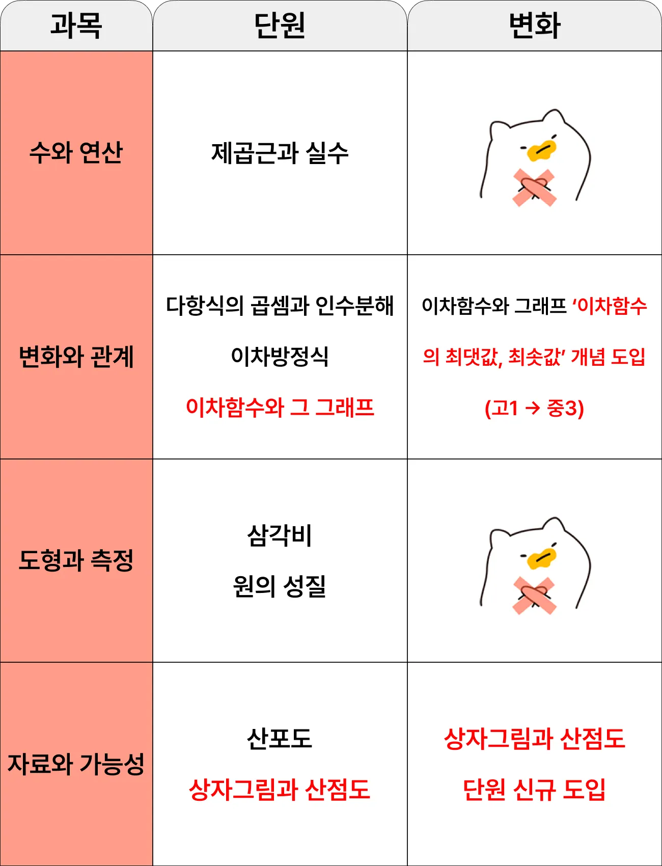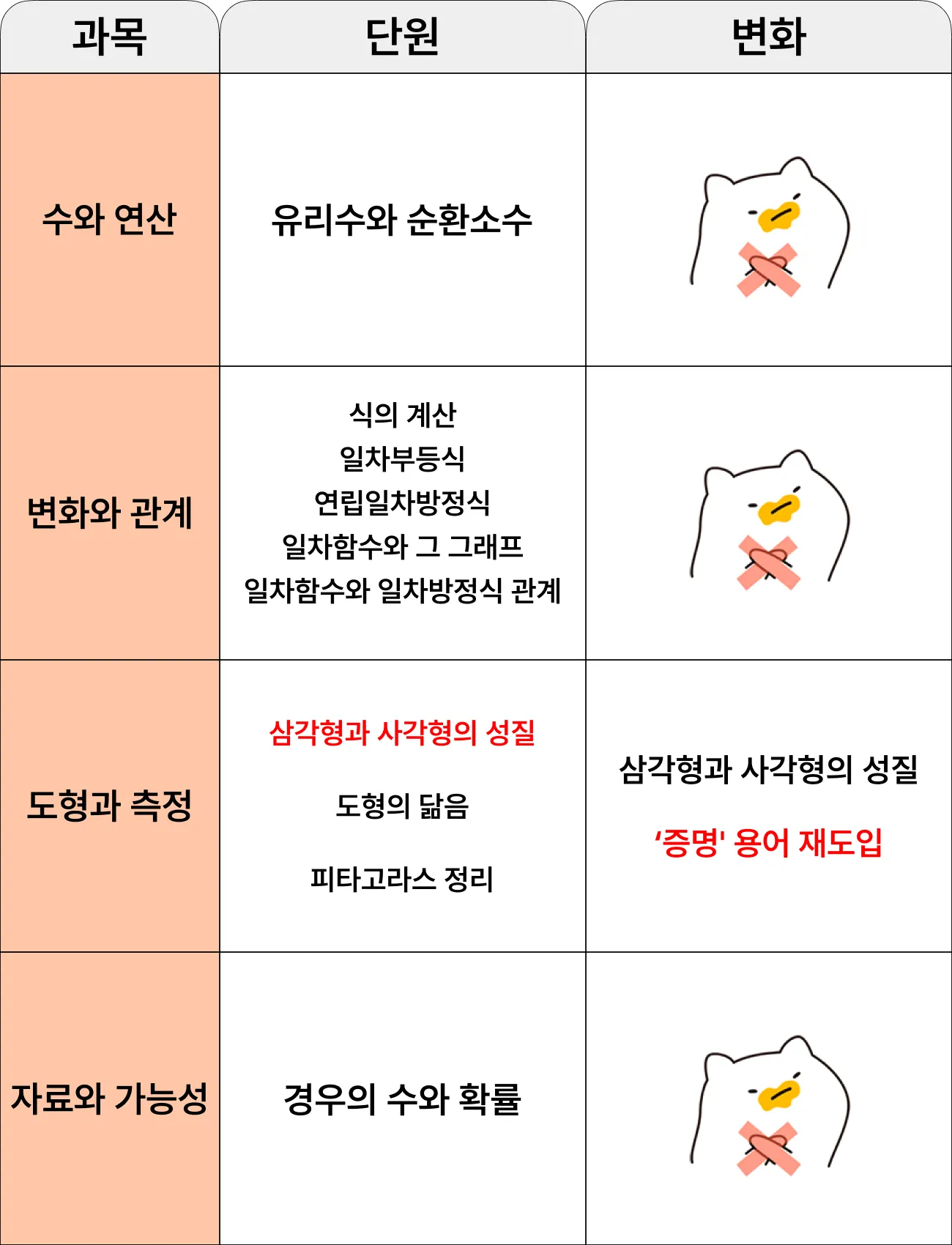 과목명과 학습 내용에 큰 변화가 없습니다.