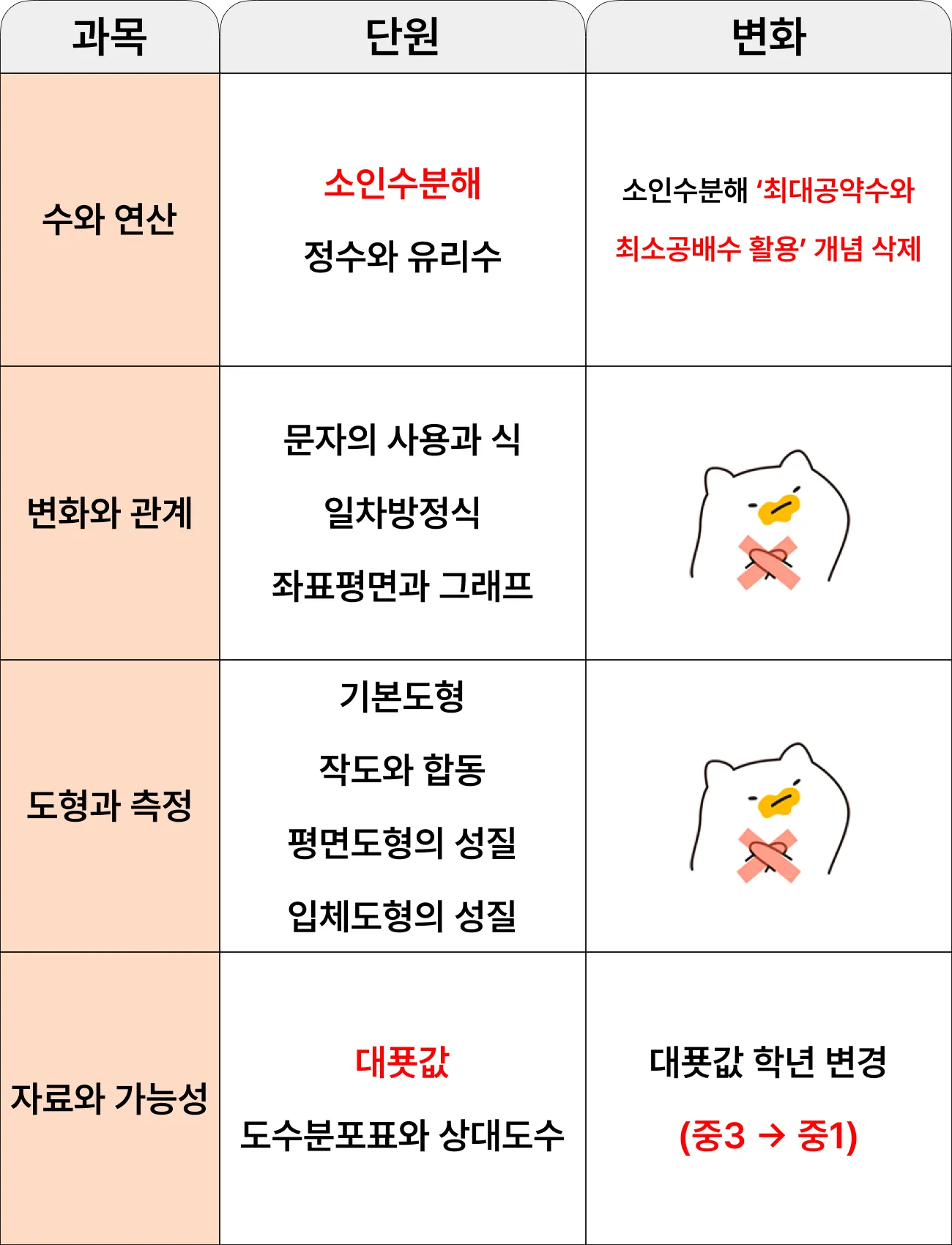 수학 과목에 추가되는 개념 및 단원 변화를 확인하시기 바랍니다.